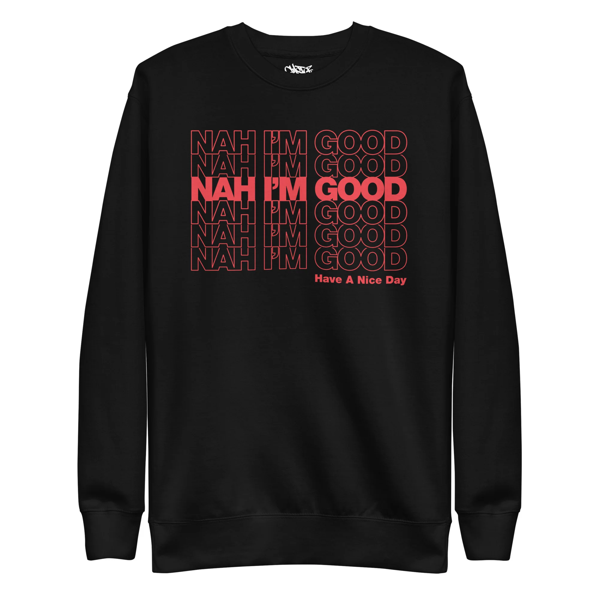In the world of contemporary streetwear, where bold logos and maximalist graphics often reign supreme, a new wave of minimal yet statement-driven pieces has quietly gained traction. Enter the “NAH I’M GOOD” Unisex Premium Sweatshirt — a garment that encapsulates modern nonchalance and cultural wit with striking simplicity.