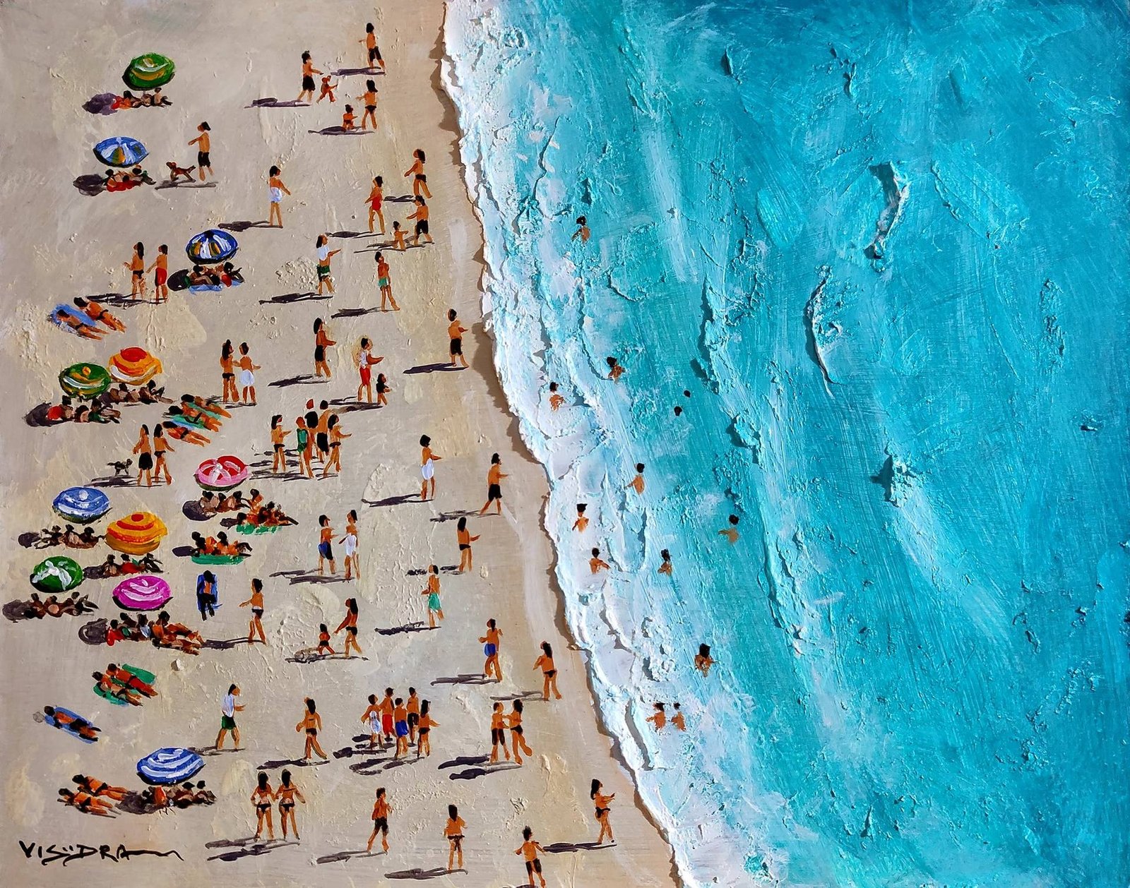 There is something irresistibly human about a beach scene: the salt breeze, shimmering waves, and scattered bodies finding moments of stillness and conjure. In Vishalandra M Dakur’s Summer Beach 22, these universal themes are distilled into a vivid, textured oil painting on wood. Yet Dakur’s work transcends simple coastal nostalgia—it speaks to deeper cultural and emotional undercurrents, situating itself in a long lineage of art that explores humanity’s complex relationship with nature, leisure, and identity.