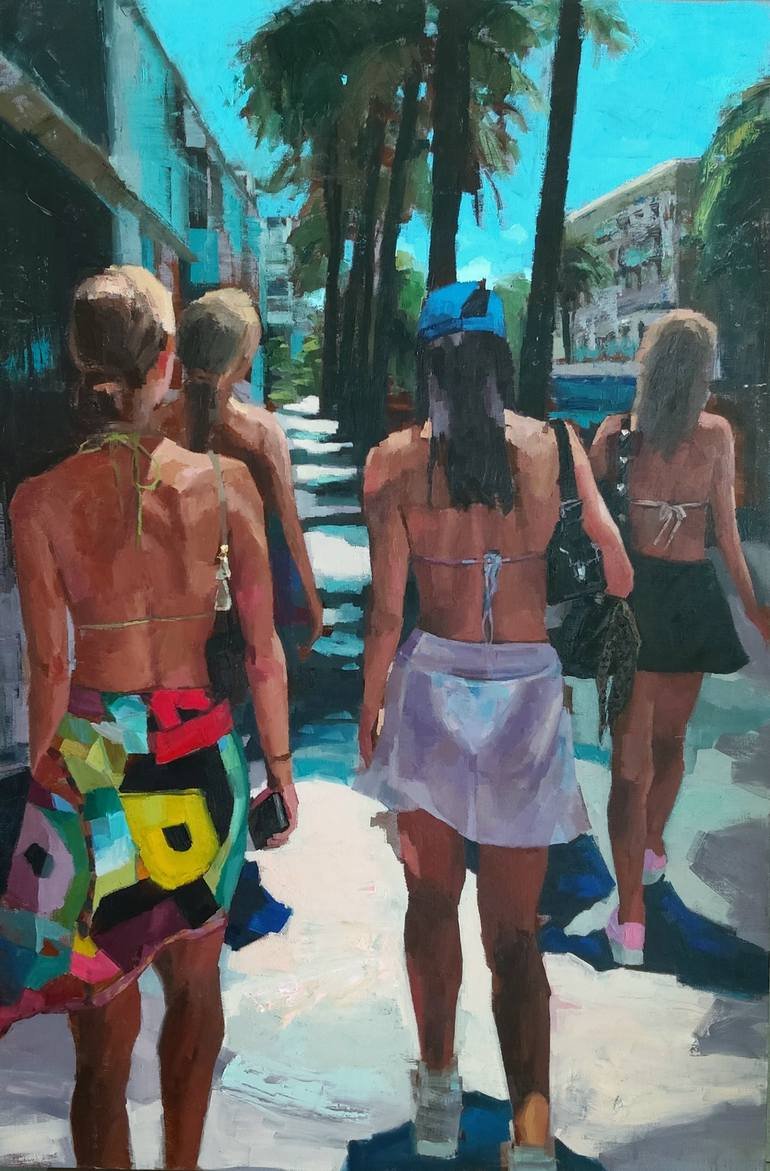 In this painting, the colors act as emotional surrogates. The oranges and pinks evoke childhood heat and ice cream sunsets; the emerald tones remind us of grass stains and open fields; the blues speak of distance and longing, as if looking at the sky and wondering where one belongs.