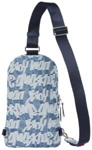 The Supreme Fat Tip Jacquard Denim Sling Bag in Blue is what happens when fashion doesn’t just reference graffiti but participates in its grammar. It’s not a costume. It’s a continuation.