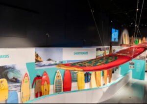A highlight of the exhibition is the display of 100 surfboards that trace the technological and stylistic advancements in surfboard design. This collection includes early wooden bellyboards from the 1920s, fiberglass longboards from the mid-20th century, and contemporary eco-friendly boards. Notably, the exhibition features a 37-foot surfboard capable of carrying 15 surfers simultaneously, exemplifying the innovation within the surfing community.