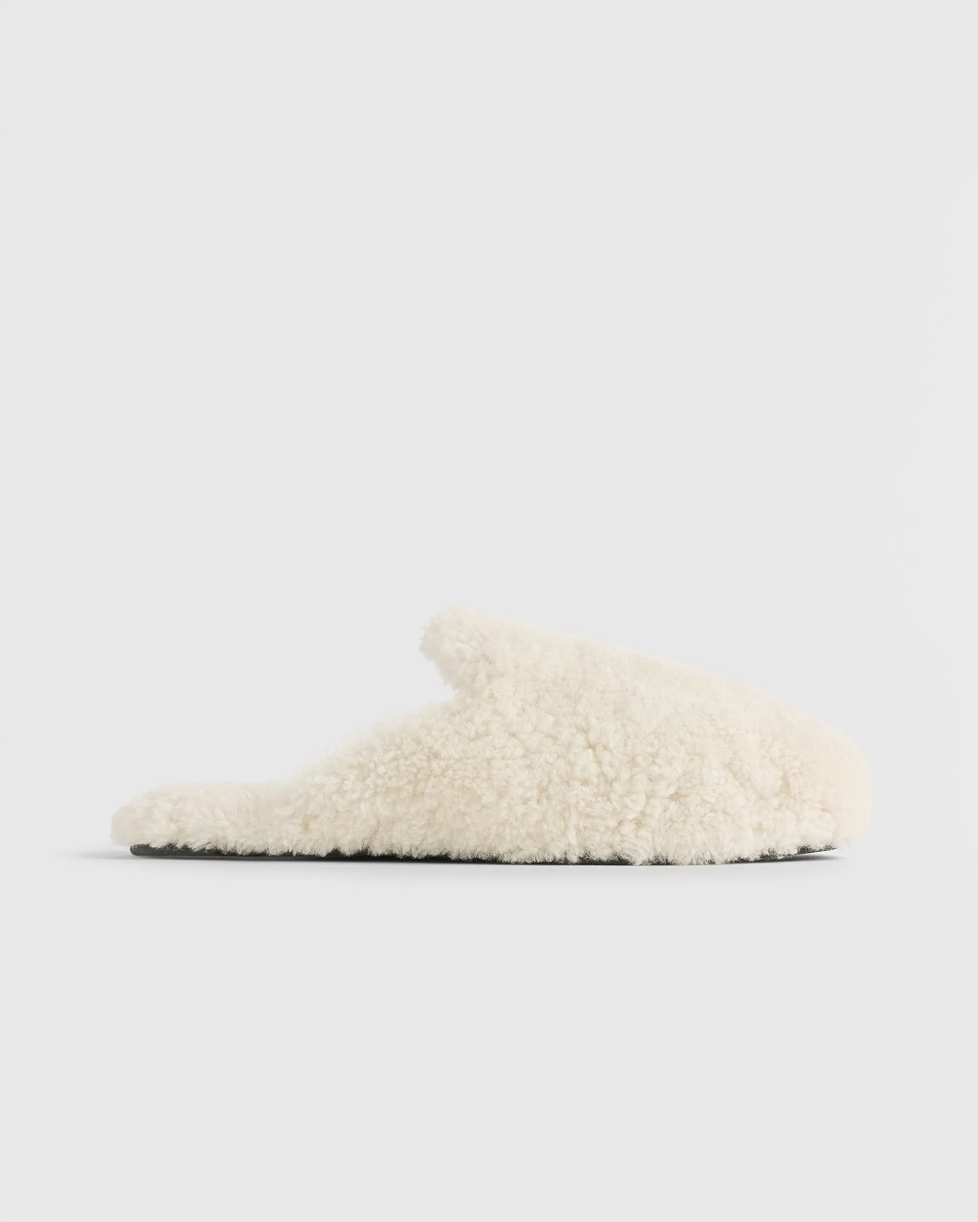The defining feature of Tekla’s slippers is their tactile richness. Crafted from plush shearling, the exterior presents a dense, cloud-like texture that feels both organic and engineered. The wool fibers are not overly processed; instead, they retain a natural irregularity that enhances their visual depth. This creates a surface that catches light subtly, shifting between matte softness and gentle luminosity depending on movement.