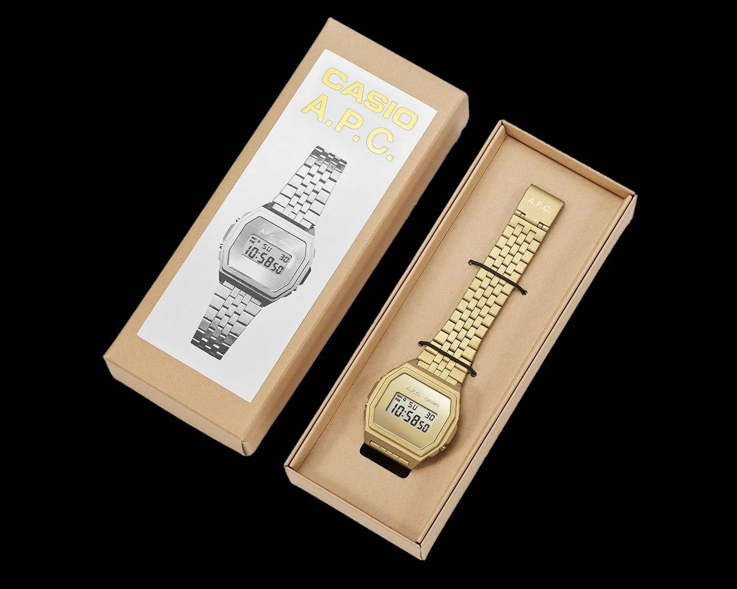 The Casio x A.P.C. A1000 collaboration is particularly appealing due to its minimalistic aesthetic, a defining feature that separates it from traditional Casio models. One standout detail is the dial, which embodies an uncluttered look. A.P.C. has stripped the display of excess labels, colors, and markings typical in Casio’s design, leaving only its own branding and Casio’s logo at the top. This design choice results in a refined, cohesive appearance where the dial matches the case and bracelet, available in either gold or silver.
