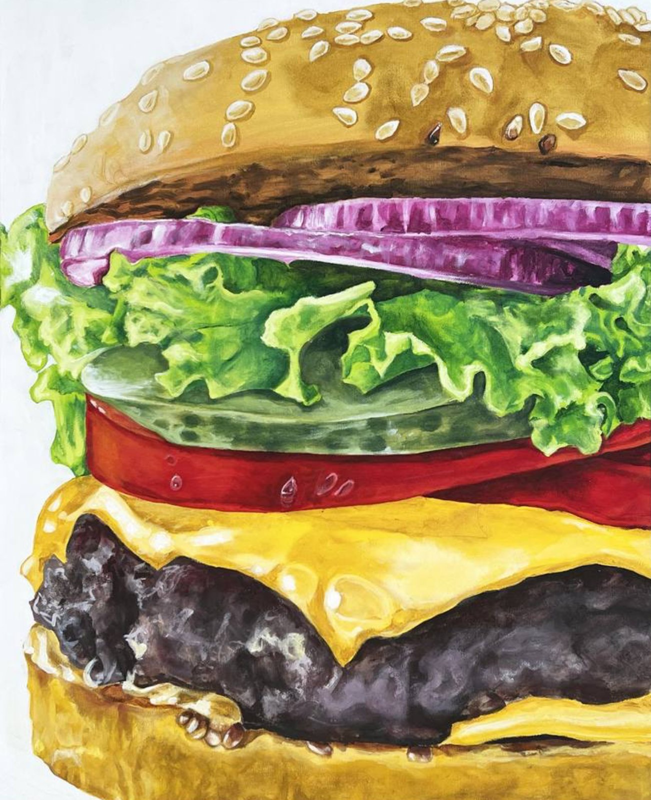 “The Cheeseburger Deluxe” sits comfortably within the lineage of American Pop Art and Hyperrealism, tracing its aesthetic DNA from Wayne Thiebaud’s dessert landscapes to Audrey Flack’s glossy photoreal still lifes. However, while those artists often meditated on the tension between object and illusion, Haghighi approaches it with a distinctly Gen X-to-Millennial filter, where nostalgia and irony co-exist.