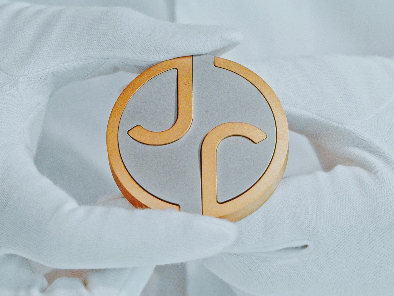 The new logo abandons the familiar snarling jaguar face for a circular badge that centers on an intertwined “J” and “r,” presented in a refined brass finish. This design is surrounded by a curved border, creating a sense of continuity and focus. The gold-and-white contrast of the emblem exudes a contemporary sophistication, with the brass accents serving as a subtle nod to luxury.