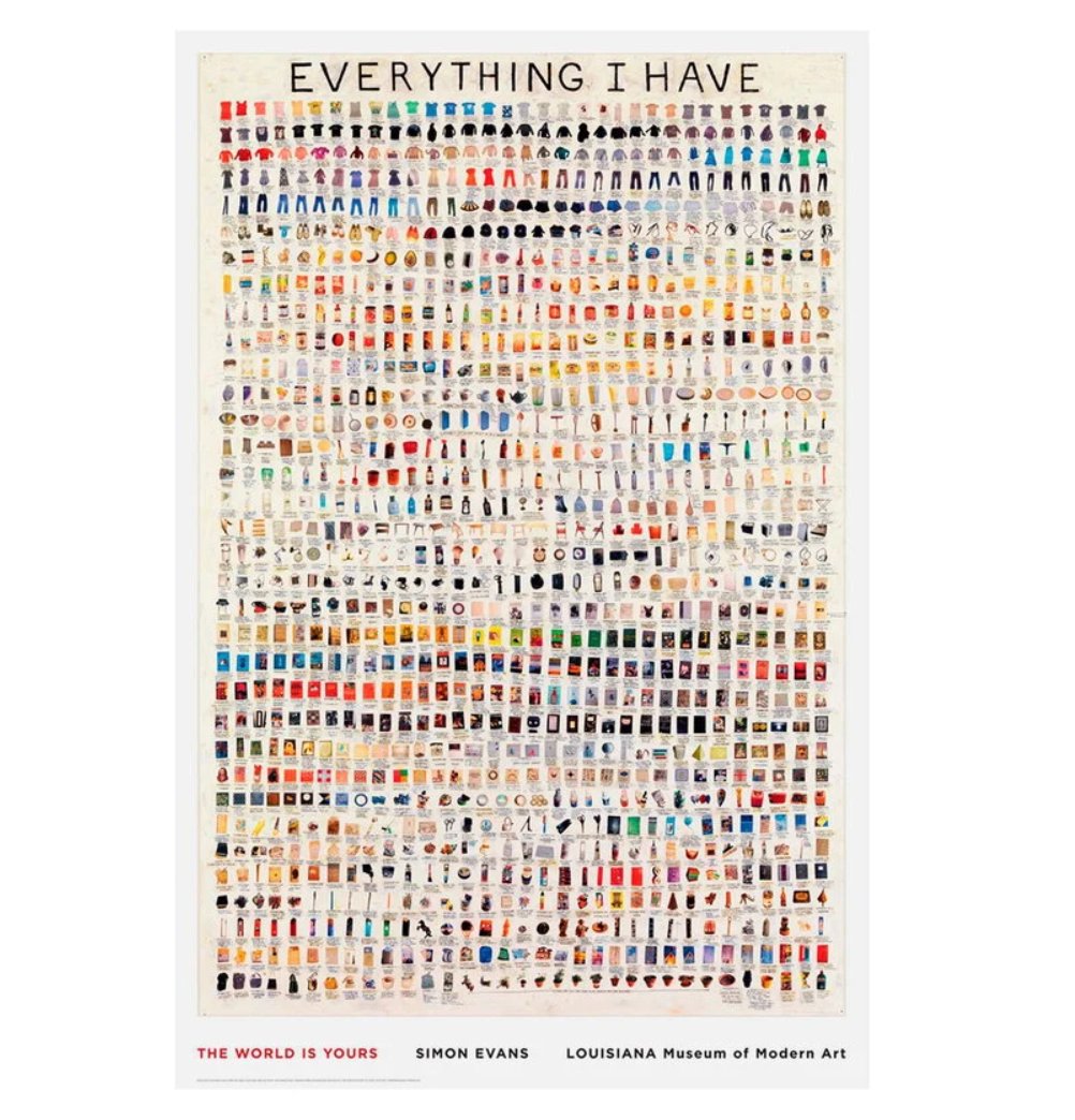 Tucked into the cool modernist curves of the Louisiana Museum of Modern Art in Denmark hangs a deceptively simple poster. Everything I Have by Simon Evans is more than just wall décor. It’s a life inventory, a visual confession, and a quiet act of radical transparency. Composed of hundreds—nearly a thousand—intricate, handwritten and hand-drawn miniatures, the work catalogs every single possession the artist owned at the time.