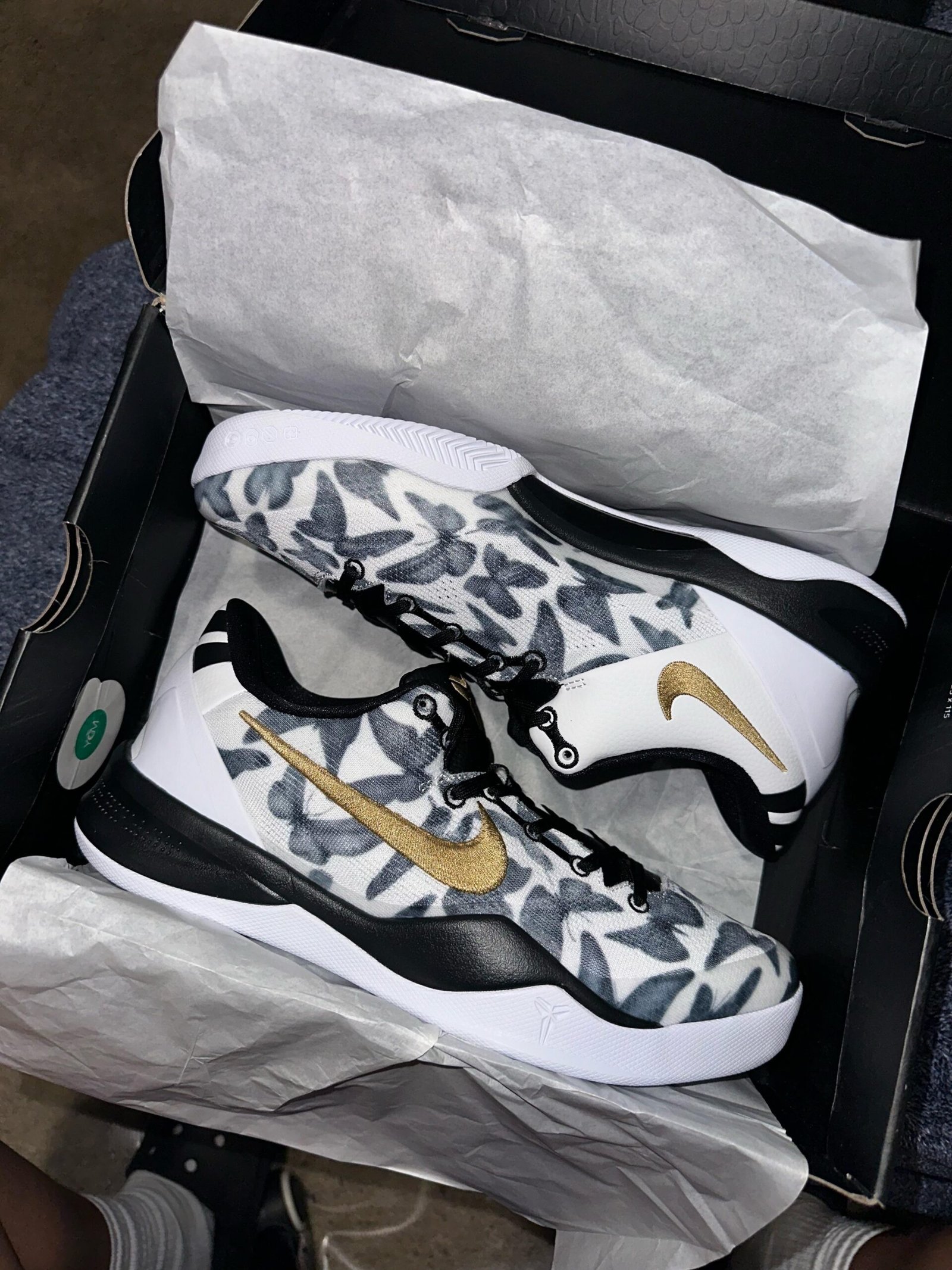 Colorway and Aesthetics: The shoe features a distinctive colorway that combines black and white, symbolizing the duality of their lives and legacies. The black represents Kobe’s fierce competitiveness and resilience, while the white signifies Gigi’s purity, potential, and the promise of a bright future. Accents of gold are integrated to celebrate their achievements and enduring impact on the sport.
