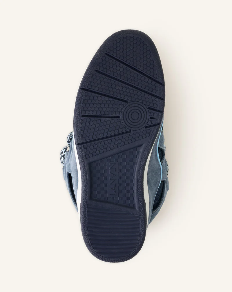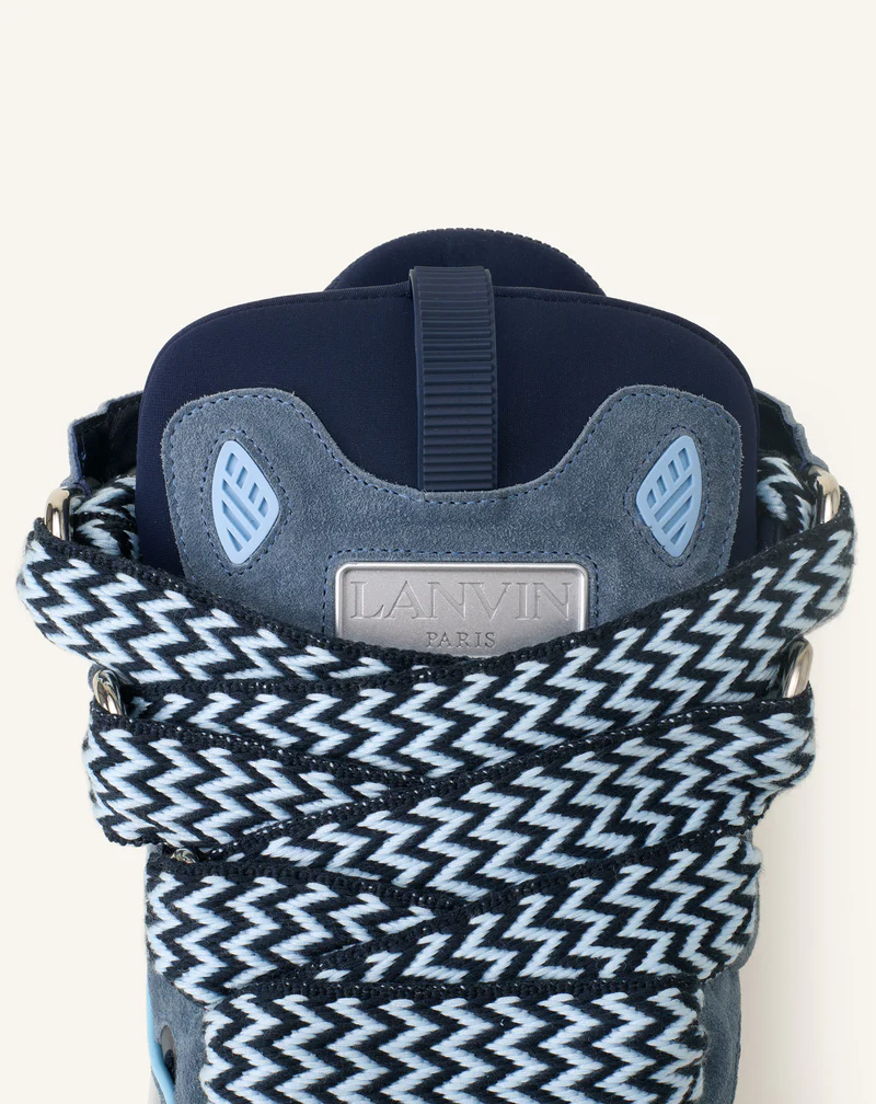 For the current season, Lanvin introduces new color combinations that extend the Curb’s visual range without diluting its identity. Classic white and black remain foundational, offering clarity and versatility. Newer iterations push further — deep navy suede with contrast accents, saturated blues, softened greys, and controlled injections of pink or multicolor detailing.