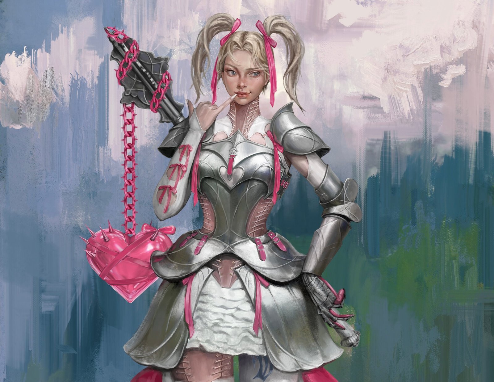 One of the most striking features of the painting is the heart-shaped flail clutched in the knight’s hand. The weapon—seemingly absurd with its plush, candy-pink exterior and spiky accents—is chained in matching pink links. This design introduces a whimsical, almost toy-like quality to an otherwise deadly object, transforming a symbol of destruction into an artifact of affection and charm.