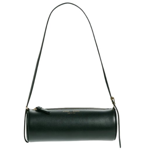 The proportions are thoughtfully scaled for the shoulder or elbow, suspended by a single strap of matching leather—neither too wide nor too narrow. It arches modestly, fastened by discreet gold-toned hardware that neither shimmers nor shouts. The strap itself attaches at each end of the cylinder with a looped tether, creating continuity between bag and body. There is no detachable crossbody option, no belt-convertible trickery. This is a bag that believes in its singular purpose. It is a shoulder bag, and it leans into that purpose with sartorial integrity.