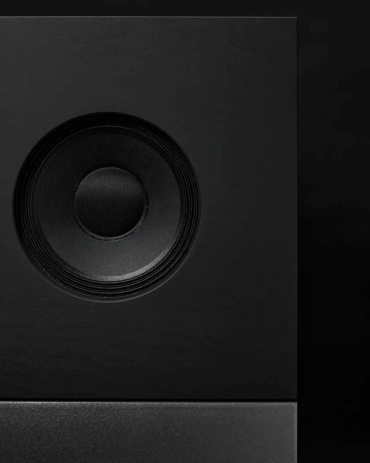 At first glance the speakers appear almost monolithic. Each unit consists of two stacked rectangular volumes. The top section houses the speaker driver, presented as a dark circular aperture centered within a matte black faceplate. Beneath it sits a larger block finished in brushed metal or textured aluminum.