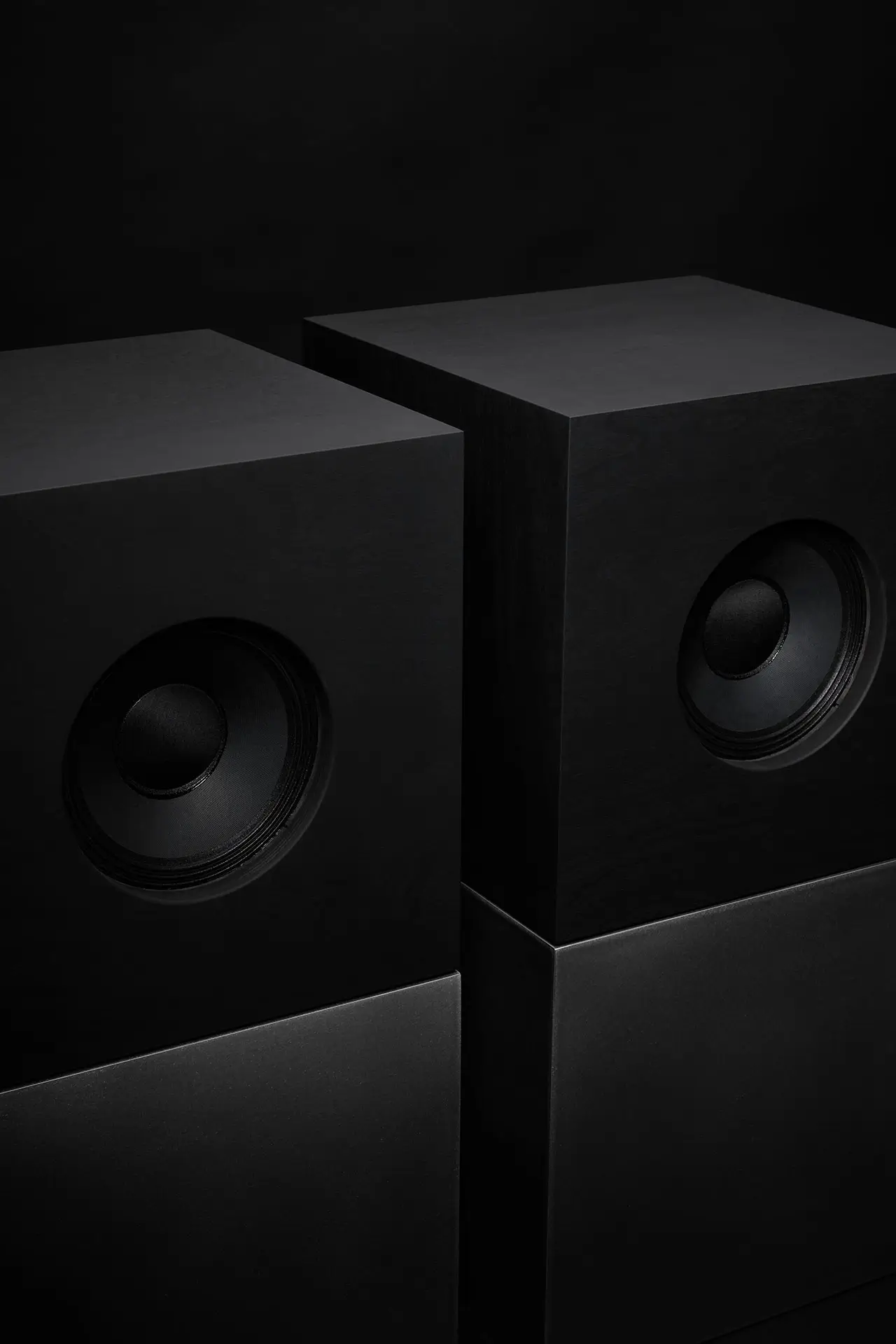 Rather than appearing lightweight or hidden, the speakers occupy space like sculptural objects.
