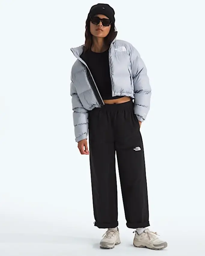 The defining element is, undeniably, the cut. By shortening the hem, The North Face unlocks a new dynamic—one that balances the familiar padded bulk with a flattering, cropped proportion. It hits at a place that accentuates the waist without sacrificing warmth, creating a shape that harmonizes with high-waisted trousers, joggers, leggings, long skirts, and even denim. It’s the type of silhouette that makes winter dressing feel less like armor and more like intentional styling.