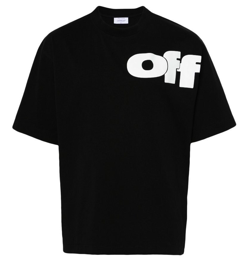 The logo itself is another defining element. Printed in an upsized typeface, the “Shared Logo” wraps around the body, a bold and eye-catching choice that lends the tee its distinctive edge. The logo’s positioning and size play with the boundaries of conventional branding, subverting expectations in a way that feels both playful and subversive. Off-White has always been known for its conceptual approach to branding—where logos and text are not merely decorative, but central to the garment’s identity. Here, the wraparound text becomes a statement in and of itself, turning the logo into a kind of wearable art that transcends its functional role as a brand identifier.