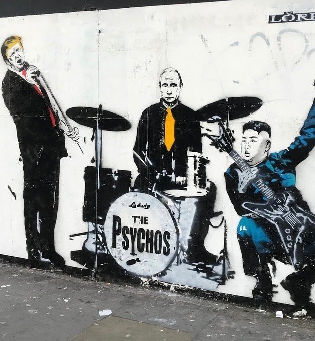 These depictions are not subtle, nor are they meant to be. The artist uses the hyperbolic language of satire to drive home a point: that these leaders, despite their power and influence, are fallible, dangerous, and often motivated by selfish interests rather than the greater good. The mural suggests that they are “psychos” in the sense that their actions have far-reaching consequences that hurt ordinary people and destabilize global politics.
