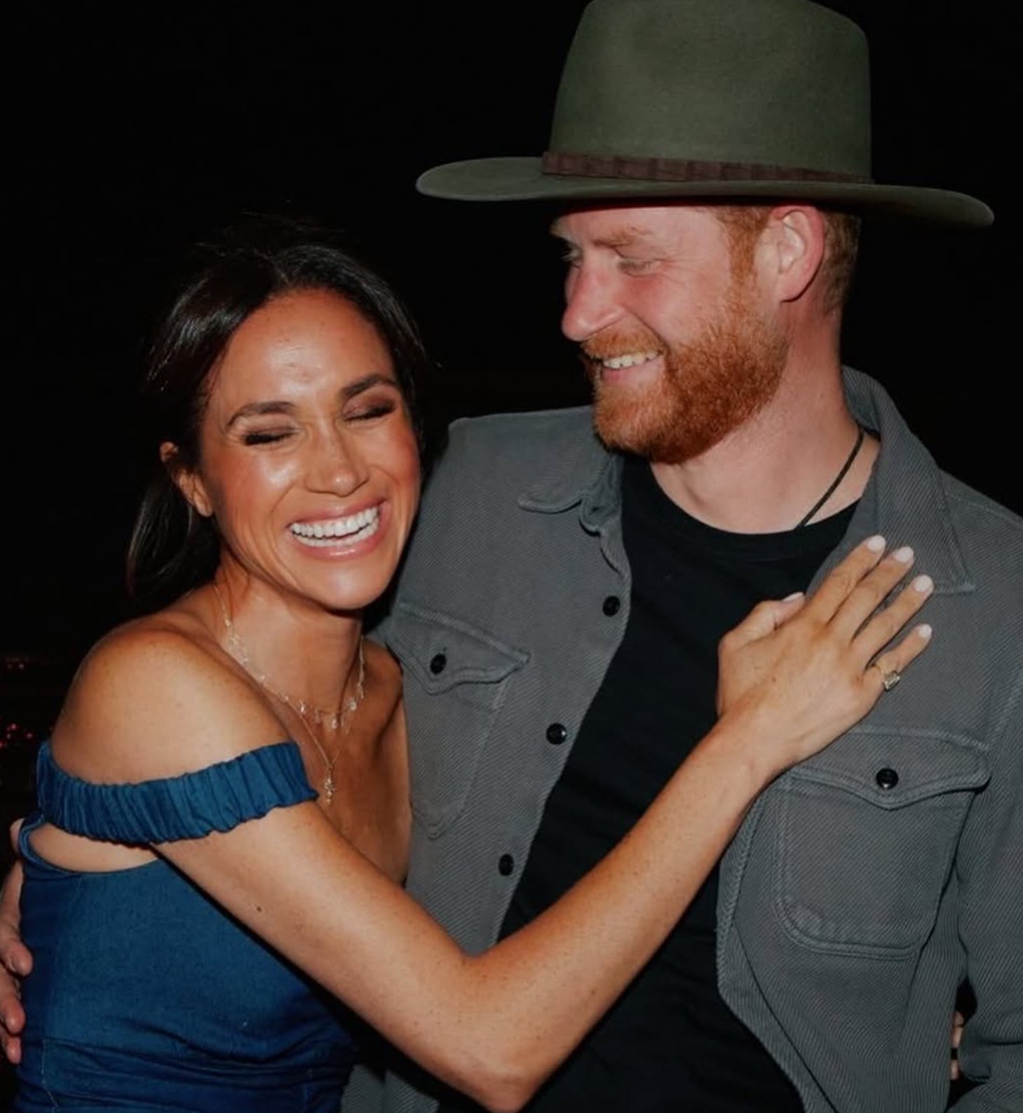Next to her, Prince Harry opted for a more conventional but no less thoughtful look: dark denim trousers, a slate-gray button-down shirt unbuttoned over a black tee, and the pièce de résistance—a forest green cowboy hat, worn with both sincerity and swagger. For a man once caught in the stiff architecture of royal protocol, this was a declaration of ease, a symbolic loosening of the collar.