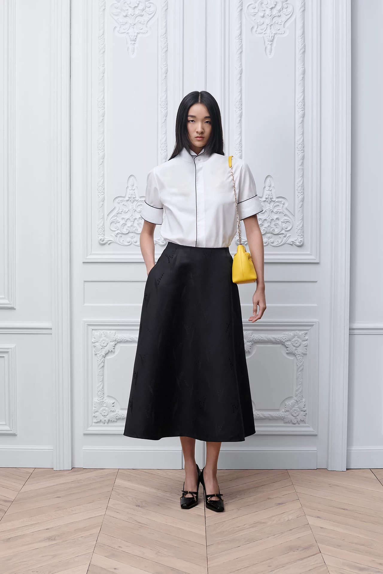 With monochrome outfits, the Buttercup color acts as a burst of brightness. A black dress or tailored suit instantly becomes more dynamic when paired with the bag.