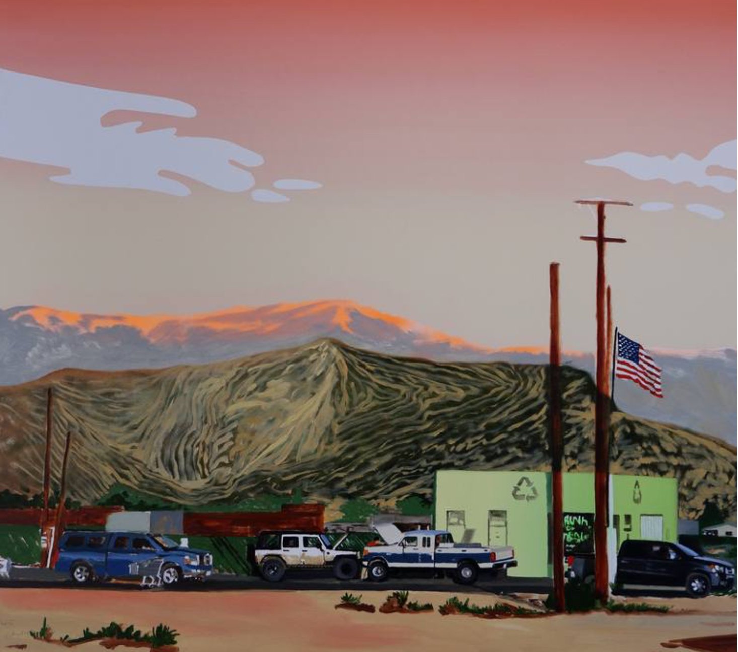 It’s tempting to read Szczur’s painting as a scene from a dystopian future—some wasteland after climate collapse or economic ruin. The broken-down vehicle, the lack of infrastructure, the total abandonment of modernity all point toward a post-apocalyptic reading. And this reading is not wrong.