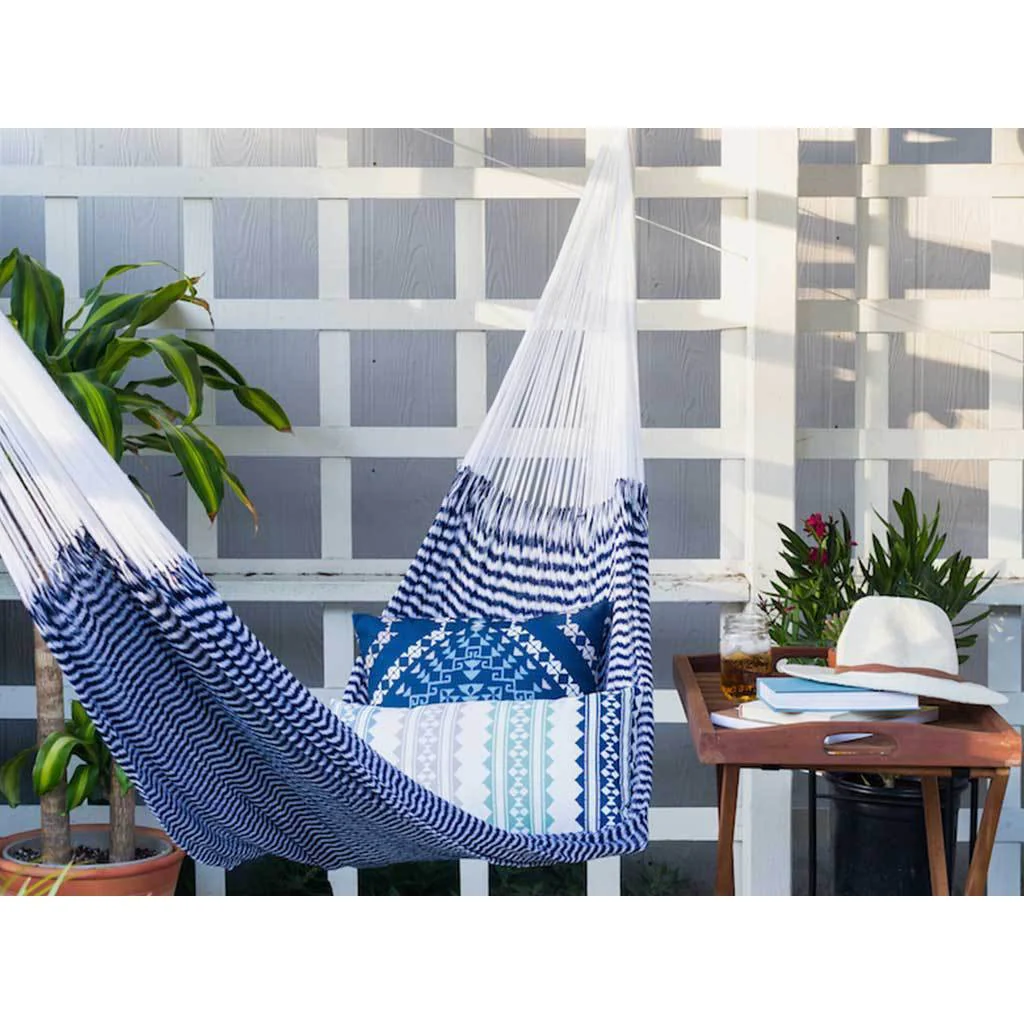 The Vineyard Haven colorway pays homage to Martha’s Vineyard, channeling the relaxed elegance of East Coast summers. Navy and white stripes evoke seersucker suits, sailboats, and timeless coastal style. Whether hung between palm trees, on a deck, or even in a minimalist living room, it’s a design piece as much as a relaxation tool.