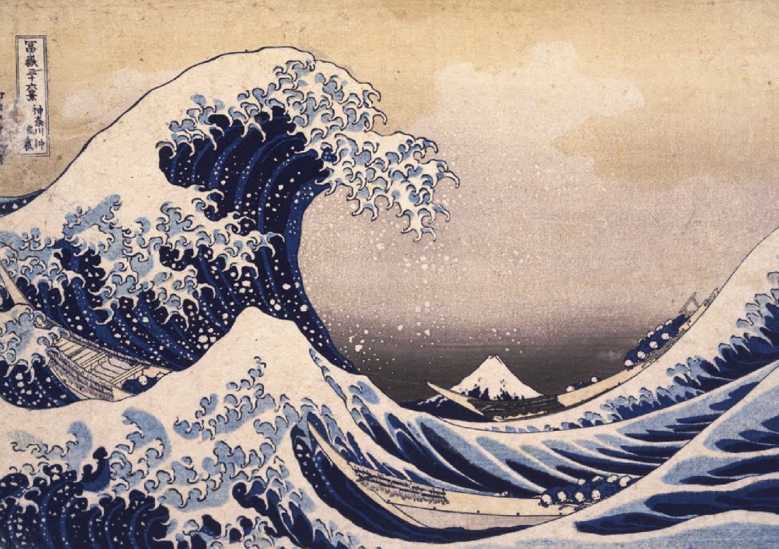 This is masterpiece of composition as characterized by its dynamic interplay of motion and stillness, power and tranquility. The central wave dominates the scene, its curling crest forming a dramatic arc that seems to envelop the boats caught in its path. The wave’s frothy tips resemble claws, imbuing it with an almost menacing, anthropomorphic quality. In contrast, Mount Fuji, rendered in soft, serene tones, stands as a distant and immovable anchor.