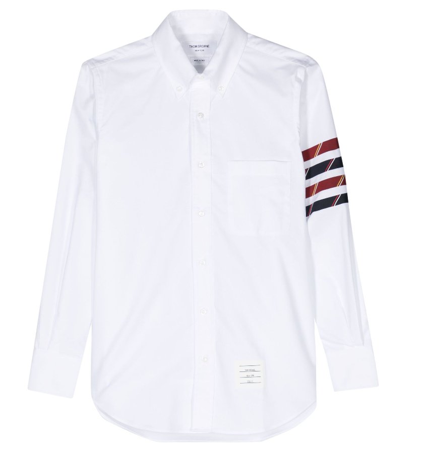 The shirt prominently features Thom Browne’s hallmark four-stripe motif on the sleeve. This subtle yet distinctive detail adds a modern edge to the classic collared shirt design, ensuring it stands out without being overly flashy.
