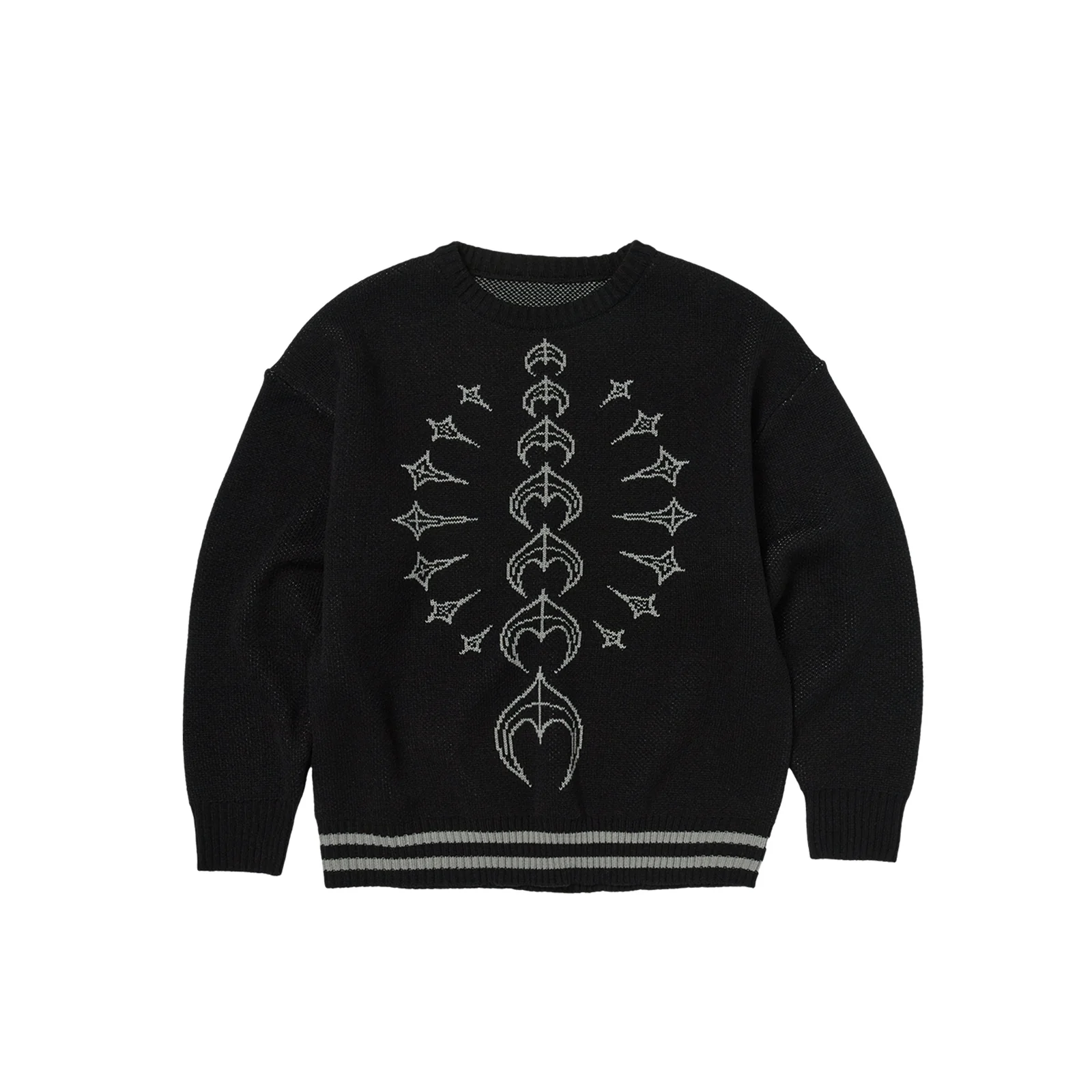 The sweater features a heavyweight cotton-blend knit construction, chosen for its durability and soft hand feel, balancing style and everyday wear. The silhouette follows Thug Club’s signature boxy fit—slightly cropped, relaxed through the shoulders, and designed to drape with attitude. Across the front and back, an intricate intarsia-knit skeleton motif sprawls in contrasting white against a jet-black base, a bold reinterpretation of anatomy as fashion language.