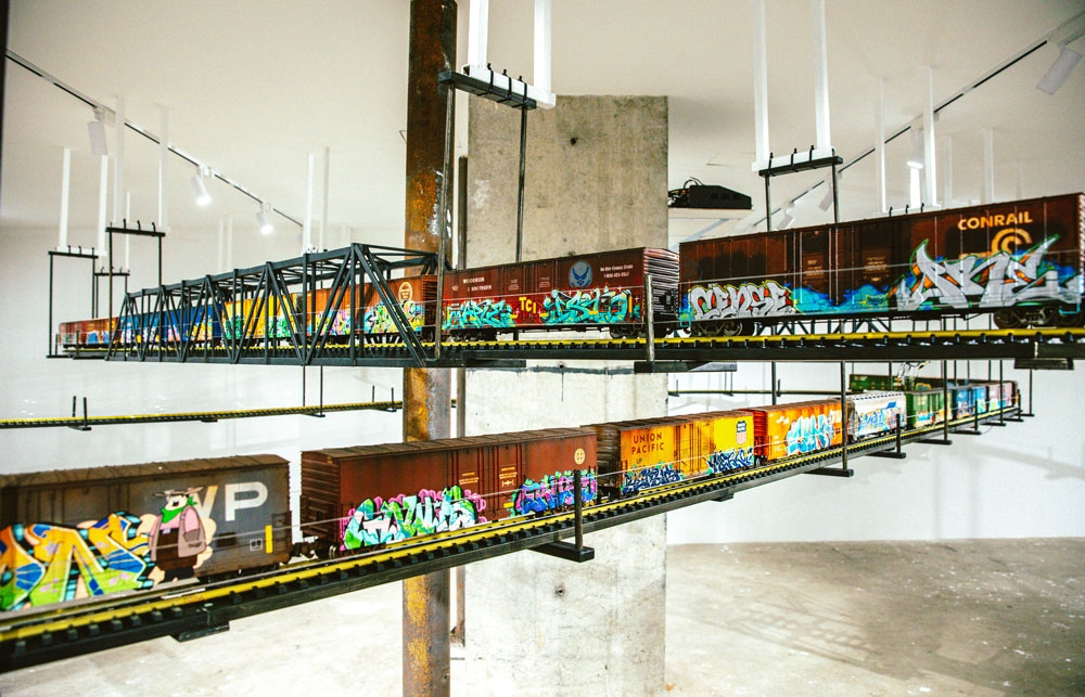 Conlon’s large-scale works often feature full-scale replicas of freight train cars covered in graffiti, bringing the authenticity of rail yard graffiti into the controlled environment of galleries and museums.