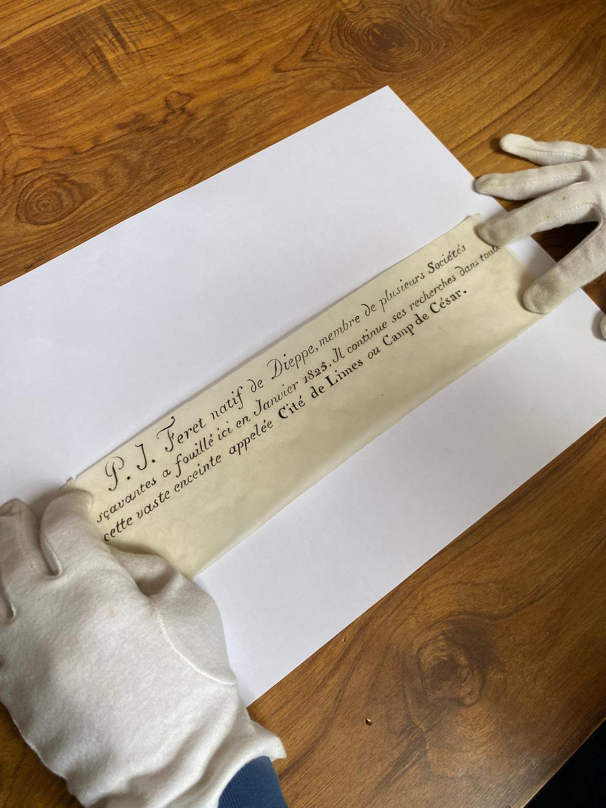 The message itself provides an insight into 19th-century archaeological practices and the individuals involved in early excavations. It was written by P.J. Féret, a native of Dieppe, who was an active member of several intellectual societies at the time. Féret’s note was brief but informative, stating, “P.J Féret, a native of Dieppe, member of various intellectual societies, carried out excavations here in January 1825. He continues his investigations in this vast area known as the Cité de Limes or Caesar’s Camp.” The statement not only reflects Féret’s involvement in the excavation efforts of the early 19th century but also highlights the historical importance of the site, referred to as the Cité de Limes or Caesar’s Camp, a title likely referencing its association with Roman or Gaulish history.