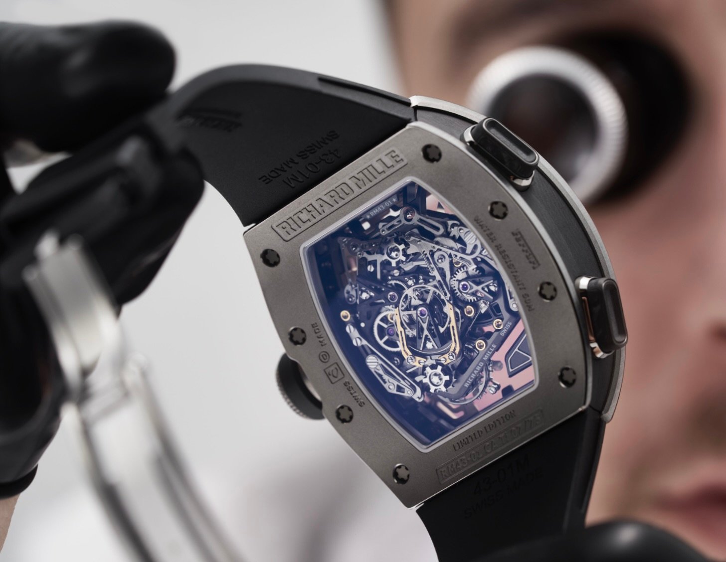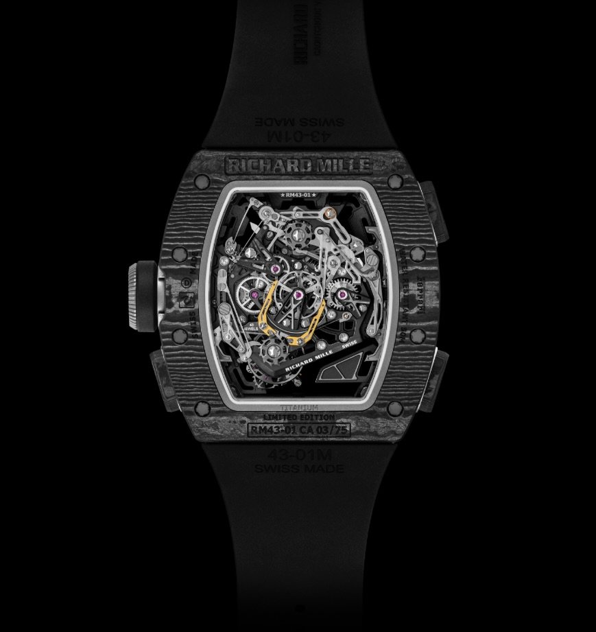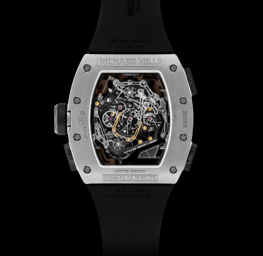 Richard Mille’s “form follows forces” worldview is visible everywhere. The tonneau case is not simply curved; it’s sculpted to manage torsion, shock, and sealing across a three-part case construction, using spline screws and engineered gaskets that maintain compression under thermal variation. Carbon TPT®—a proprietary, layered carbon composite—provides high specific stiffness at low mass and delivers that instantly recognizable striated grain; Grade 5 titaniumbrings aerospace familiarity and a colder, technical sheen. Both versions are limited to 75 pieces apiece, sharpening collectibility to track-only exclusivity levels.