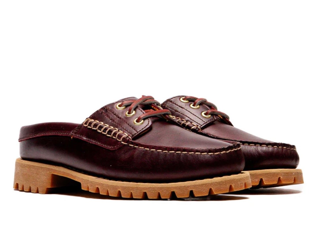 At first glance, the 3-Eye Mule may look like a traditional deck shoe — and in many ways, it is. The moc-toe stitching, rawhide lacing details, and handsewn construction echo Timberland’s beloved boat shoes that once ruled marinas and lakeside docks. But the mule twist — a fully open back — transforms the formality into an accessible, easygoing statement.