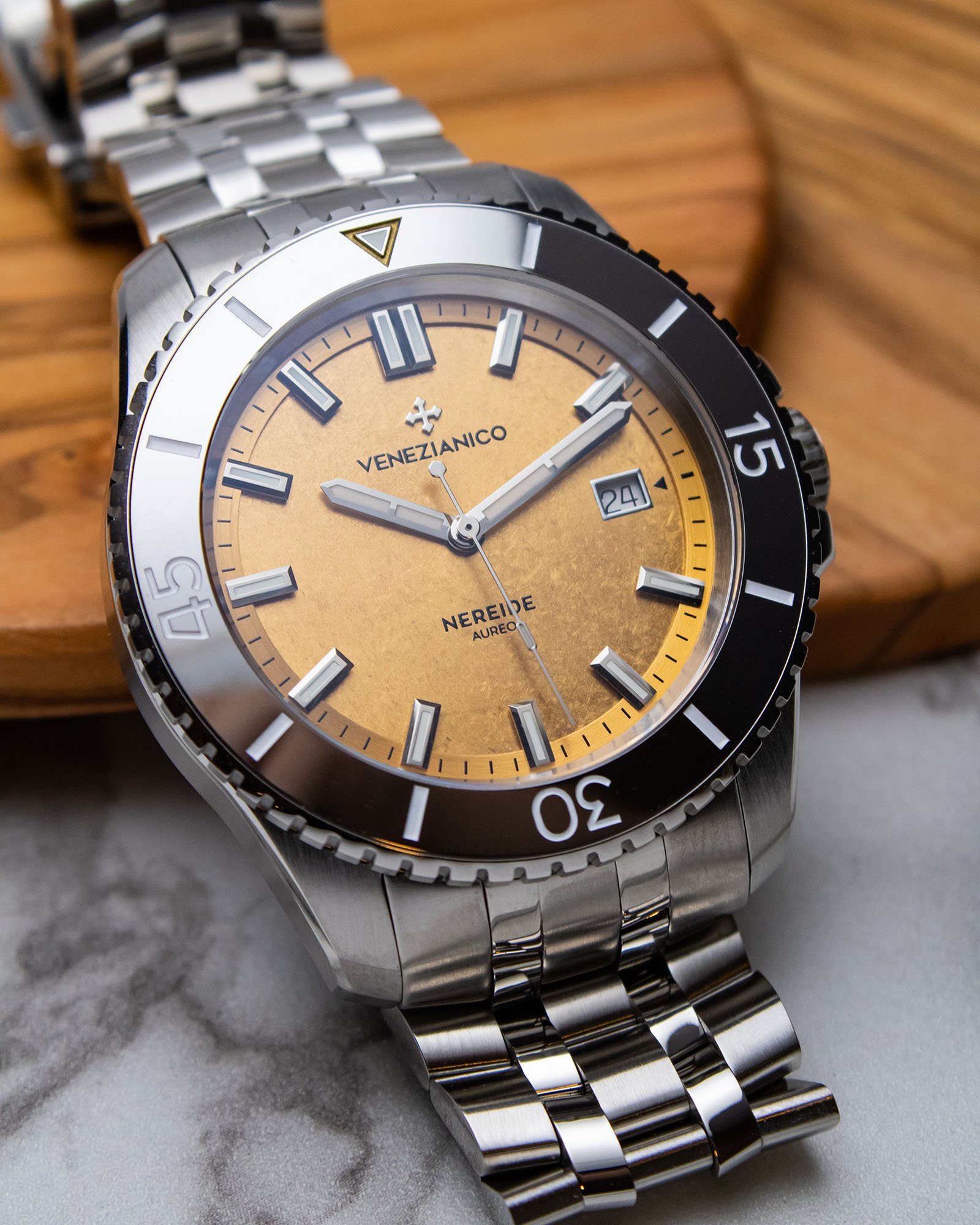 One of the defining aspects of the Nereide Aureo is its exquisite dial, which captures attention with a brushed, golden finish that radiates a warm and sophisticated glow. The Aureo dial is reminiscent of Venetian sunsets, reflecting the golden tones of Italy’s coastal charm. This unique touch sets the Nereide Aureo apart from traditional dive watches, making it as fitting in formal settings as it is on casual outings or rugged adventures. The dial is encased in durable stainless steel, carefully polished to provide a refined look that contrasts with the rugged character of a diver’s watch. This combination of elegance and robustness aligns with Venezianico’s commitment to creating timepieces that reflect Italian aesthetics and innovation.