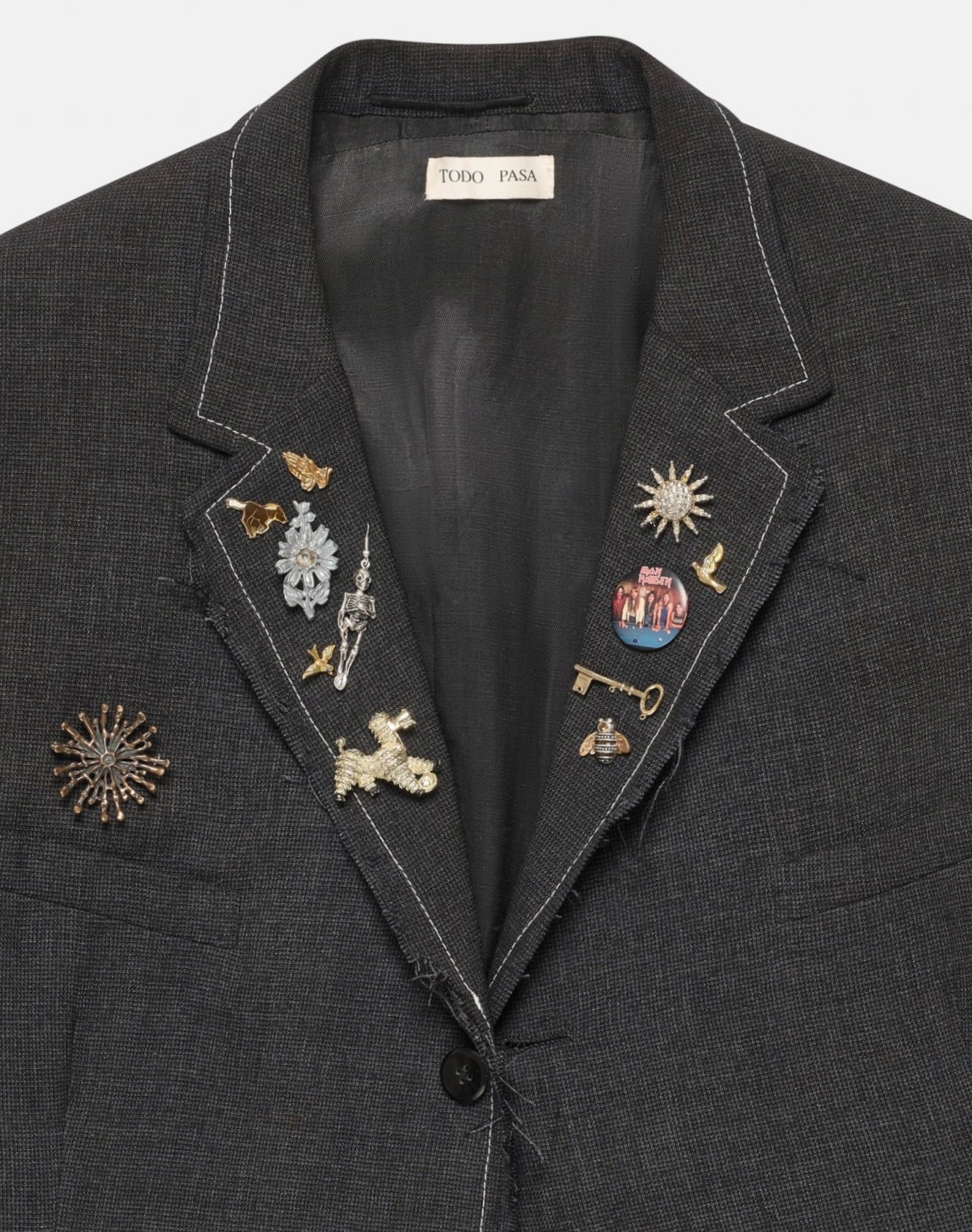 The pins across the lapel operate within that logic. They are not seamlessly integrated. They interrupt the surface. They create points of tension.