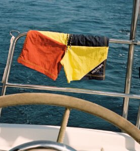 - Sailing jackets in bold color-blocked palettes (red, navy, white, and yellow), updated with eco-conscious materials and technical performance linings.