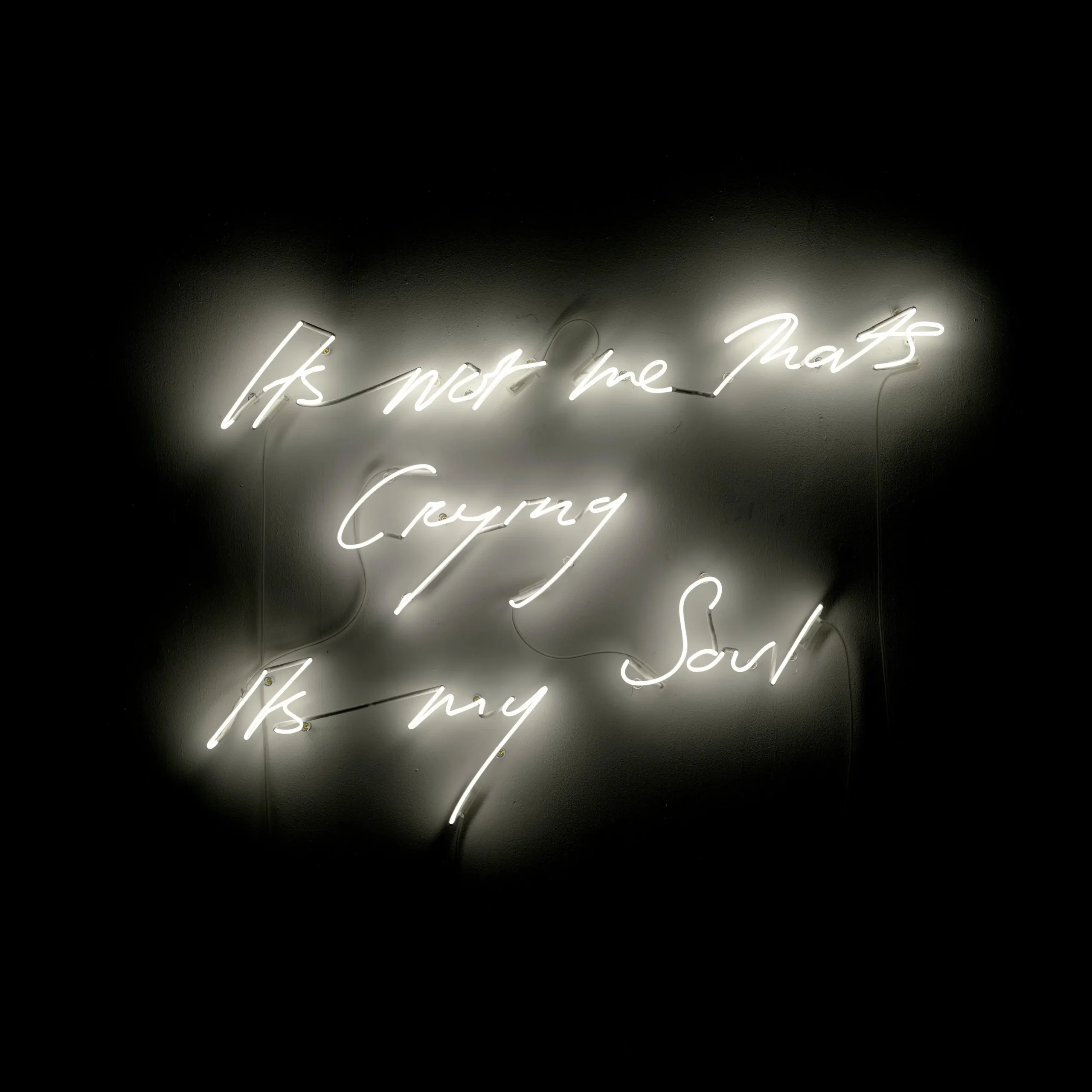 If My Bed is rooted in material reality, It’s Not Me That’s Crying It’s My Soul (2001) represents a shift toward language as medium. In this work, Emin employs neon—a material traditionally associated with advertising and urban signage—to articulate an intensely personal statement.