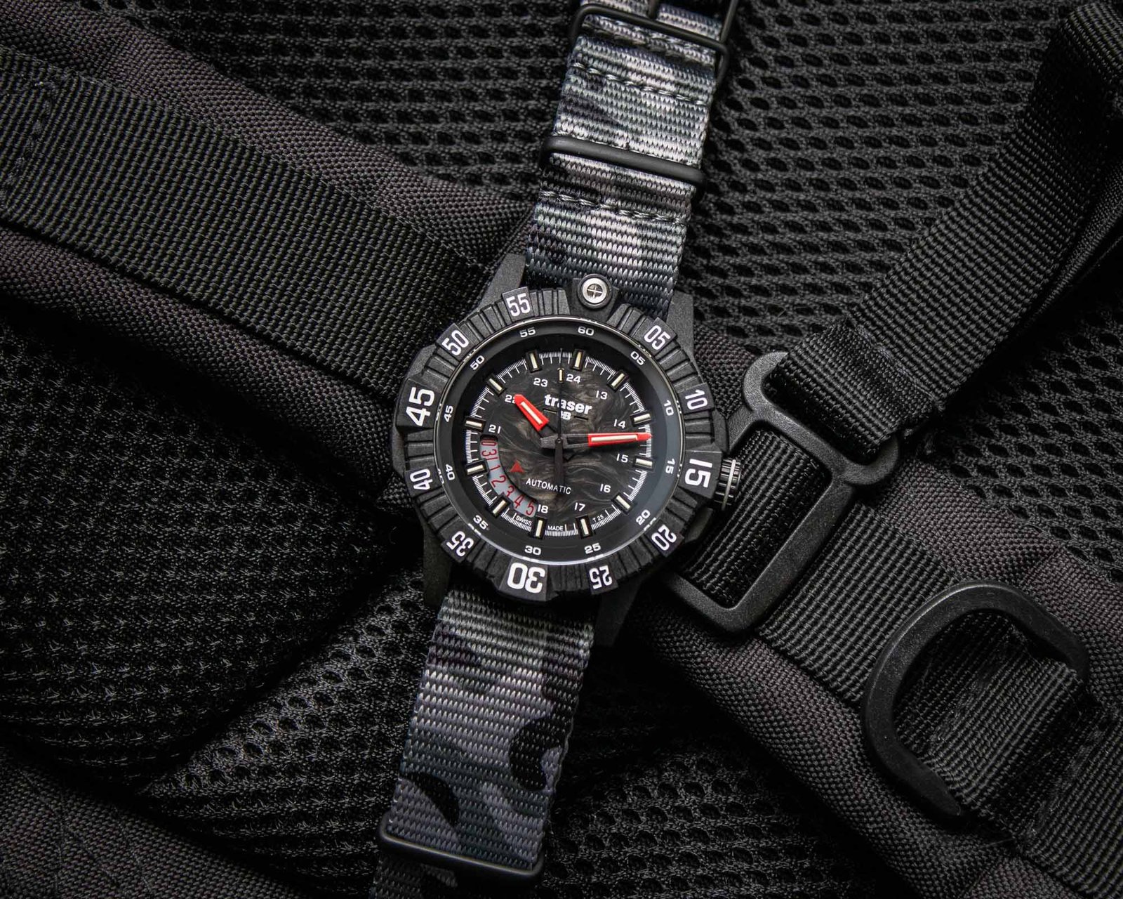 Paired with Traser’s signature tritium illumination technology, the red accents improve the overall legibility of the watch in both daylight and complete darkness, a crucial feature for military and outdoor applications.