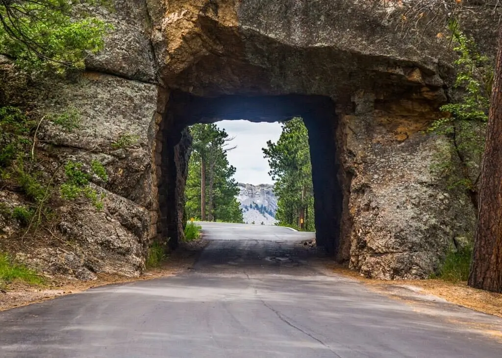 Then there is Iron Mountain Road, a route famous for its “pigtail” bridges—spiraling wooden structures that fold the road back onto itself. It is engineering as spectacle, but also as narrative. The road builds anticipation, revealing glimpses of Mount Rushmore through prudential framed tunnels, turning the act of arrival into something staged and deliberate.