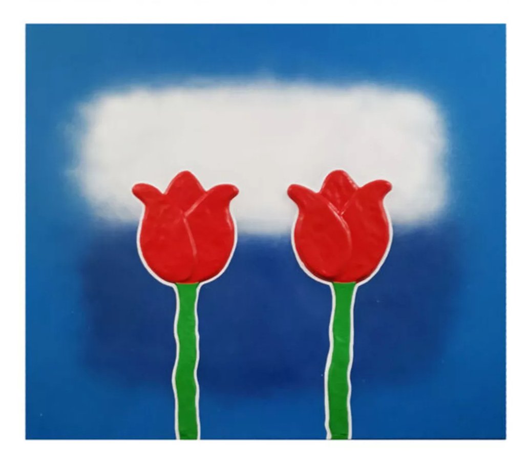 In addition to his innovative use of color, Cook also explores the relationship between form and space in his paintings. The tulips, though abstracted, retain a sense of structure and form, their outlines suggesting the graceful curves and elegant shapes of the flowers. These forms are set against expansive fields of color, creating a sense of depth and dimension that draws the viewer into the painting.