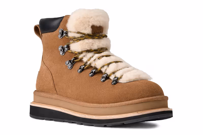 Completing the trio is the hiker boot, an emblem of outdoor heritage reimagined for modern life. It fuses UGG’s weather-ready practicality with sacai’s sculptural vision. Each pair blends rich suede uppers, plush linings, and structured outsoles built for traction. Yet, its sleek proportions and refined stitching pull it firmly into the urban landscape.
