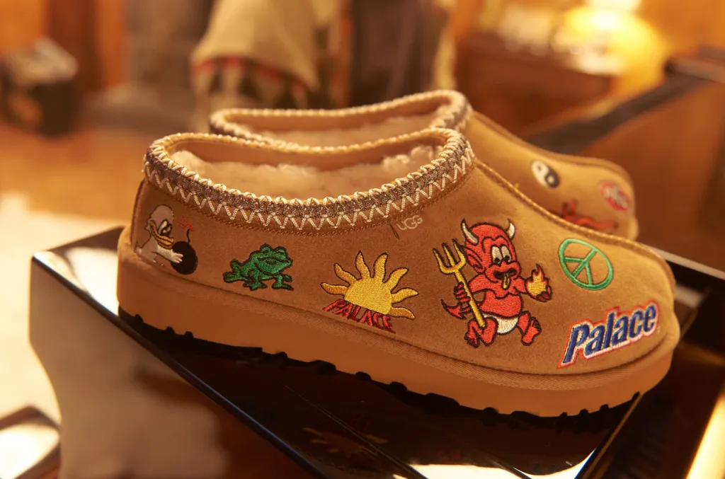 While Ugg provided the foundation for the slipper, Palace brought the design elements that make this collaboration truly special. The Ugg x Palace Tasman Slipper features custom patchwork and embroidered details that reflect Palace’s playful, street-inspired aesthetic. These details include baby devils, psychedelic sunrises, bomb-holding ducks, and the iconic Palace lettering. Each of these elements adds a layer of personality to the slipper, transforming it from a simple, comfortable shoe into a statement piece.