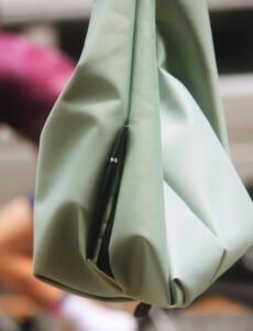 Executed in a sage green matte fabric, the bag’s outer shell is both minimalist and tactile. The material, softly coated with a synthetic finish, exudes a subtle industrial sheen—clean but not clinical, soft without being precious. It resists scratches, moisture, and slouching. More importantly, it holds the bag’s precise structure with an intentional firmness.