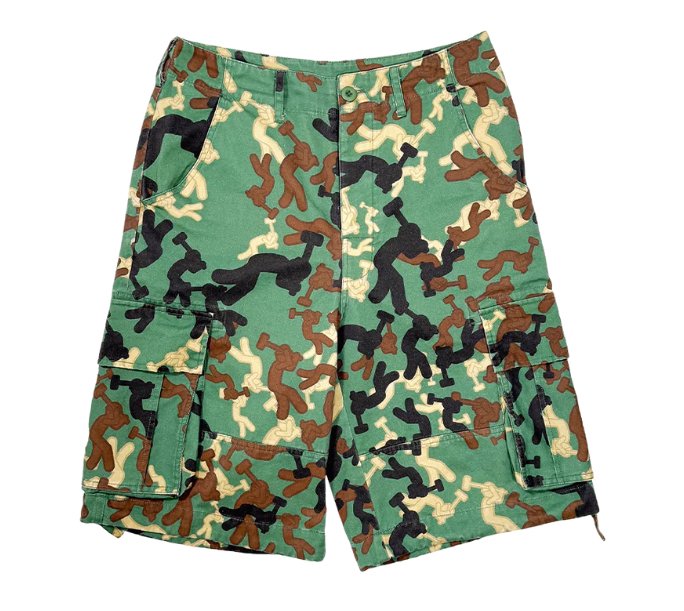 Crafted from heavyweight twill cotton, the shorts balance rugged construction with unexpected finesse. The cargo pockets are oversized and angular, lined with tonal stitching that nods to military tailoring. The print—a mix of forest green, rust brown, and shadow black—channels old-school duck hunter camo but dials it up with high-contrast finishes. At the hem: reinforced taping. At the waist: utility-style belt loops and an embroidered “WORKING MAN” patch, stitched in bold red across the back panel.