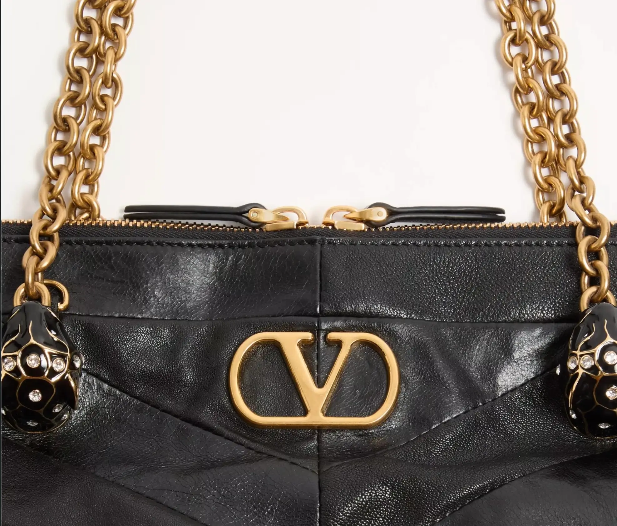 On the outside, subtle antique-gold hardware punctuates the composition. The handles connect through sculpted links shaped like feline heads — a reference that evokes both strength and sensuality. The felines’ eyes shimmer with small Swarovski crystals, adding glints of light that echo the leather’s natural sheen. Between them sits the VLogo Signature in an aged brass finish — restrained, dignified, and unmistakably Valentino.