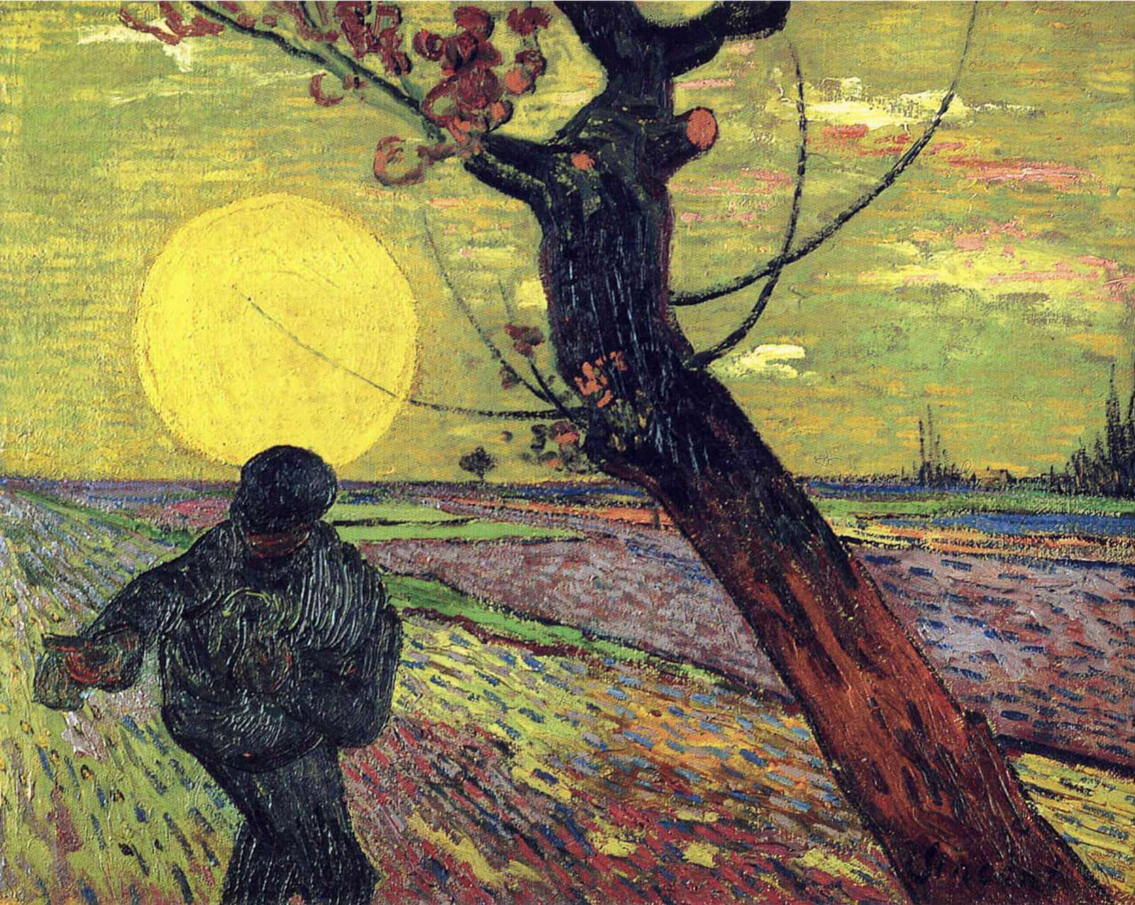 In The Sower, Van Gogh places the titular figure prominently in the foreground, silhouetted against a vibrant sky. The field stretches into the distance, blending into a horizon where the sun hovers, radiant and otherworldly.