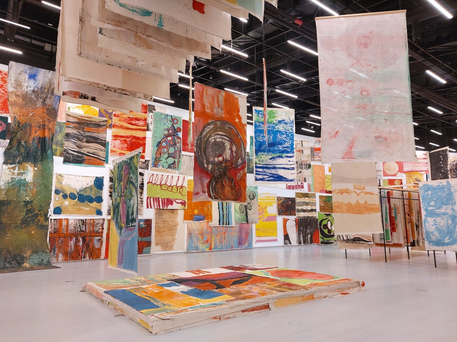 This immersive arrangement mirrors the chaotic beauty of the natural world. The paintings sway gently with the movement of visitors, emphasizing the interconnectedness between the human presence and the artwork. The installation captures the essence of fluidity—both in Suter’s brushstrokes and in the way the pieces interact with the space and audience. The viewer is not merely an observer but a participant, moving through a living, breathing ecosystem of art.