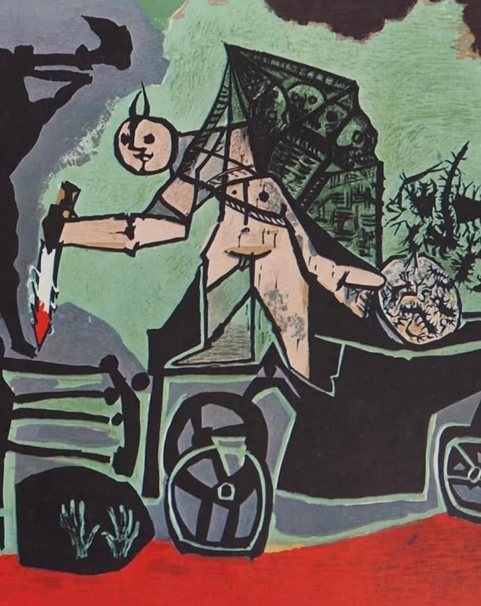 Picasso’s approach in War follows his distinctive Cubist and Surrealist-inspired style, characterized by fragmented forms, sharp angles, and distorted figures. These elements contribute to the painting’s intense emotional impact.