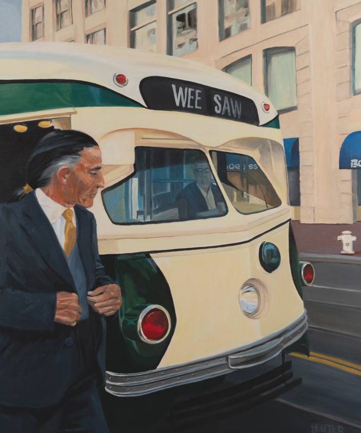 In Wee Saw, Uter uses her characteristic painterly style to invite viewers into a narrative that unfolds through subtle details. Her Edward Hopper-inspired use of light and shadow creates an atmosphere of contemplation, as if the canvas itself is a pause in time.