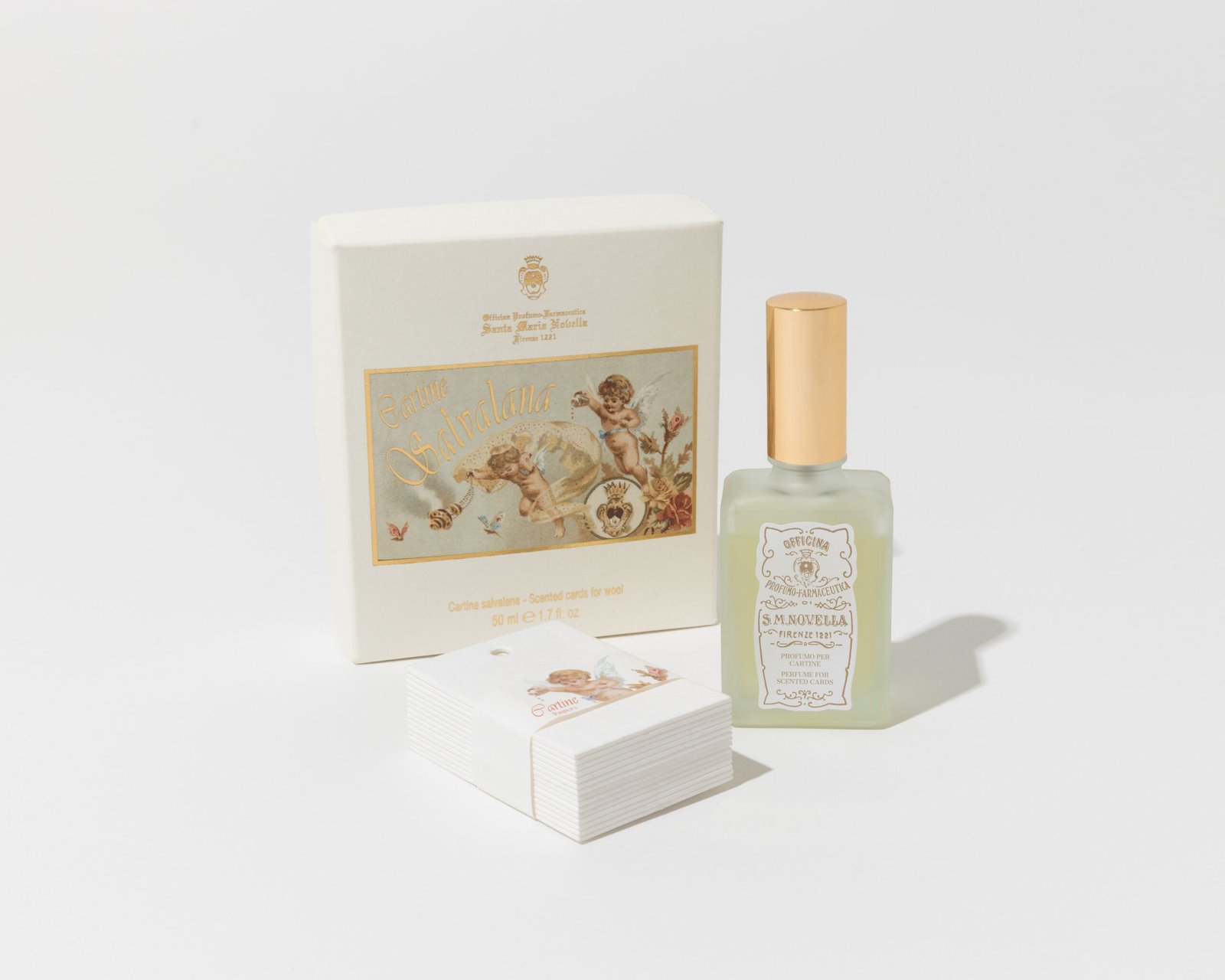 Scented Cards – Printed with delicate cherubs and gold lettering, each card is infused with a proprietary aromatic formula designed to repel insects and imbue garments with a soft, powdery elegance.