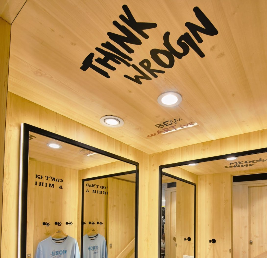 Beyond aesthetics, the store is filled with interactive and gamified elements that make shopping at WROGN an experience rather than a routine visit. The trial rooms, designed as industrial shipping crates, feature bold brand messaging alongside built-in selfie rings, transforming an otherwise mundane fitting-room experience into a shareable moment. This reinforces the brand’s digital-first approach, encouraging social media engagement directly from the store.